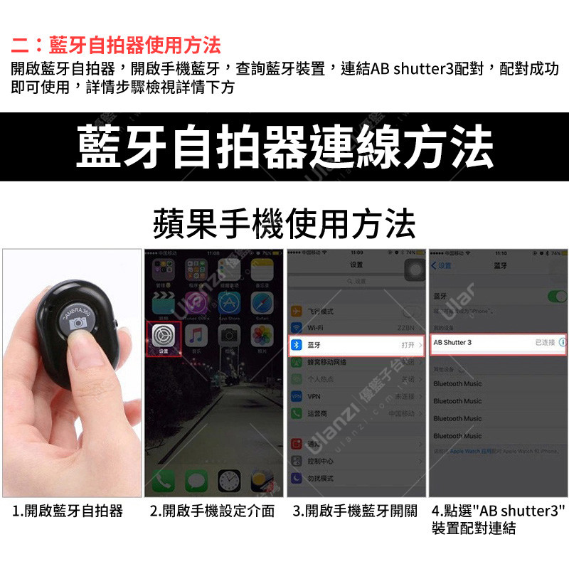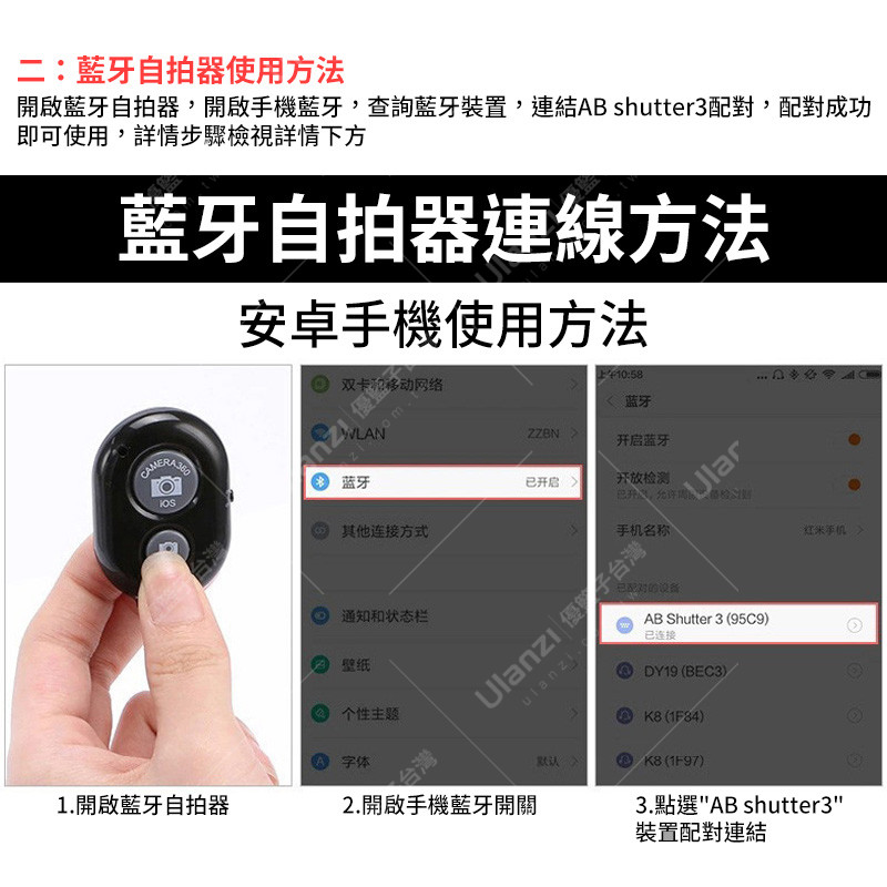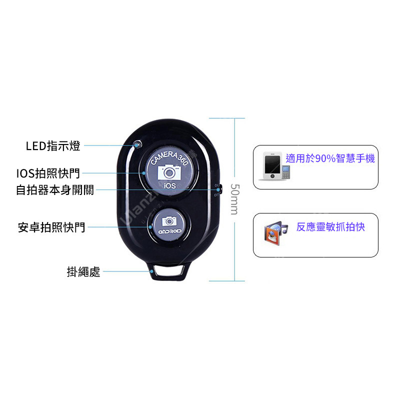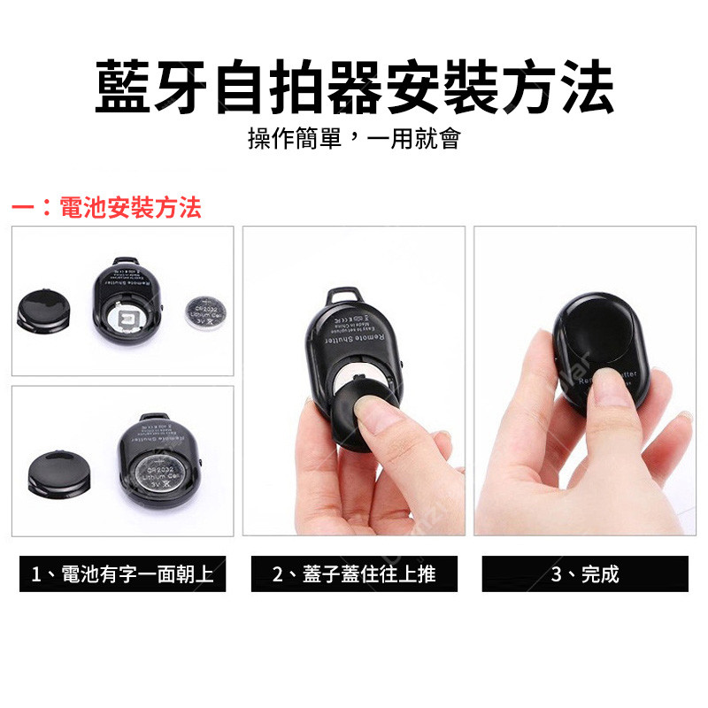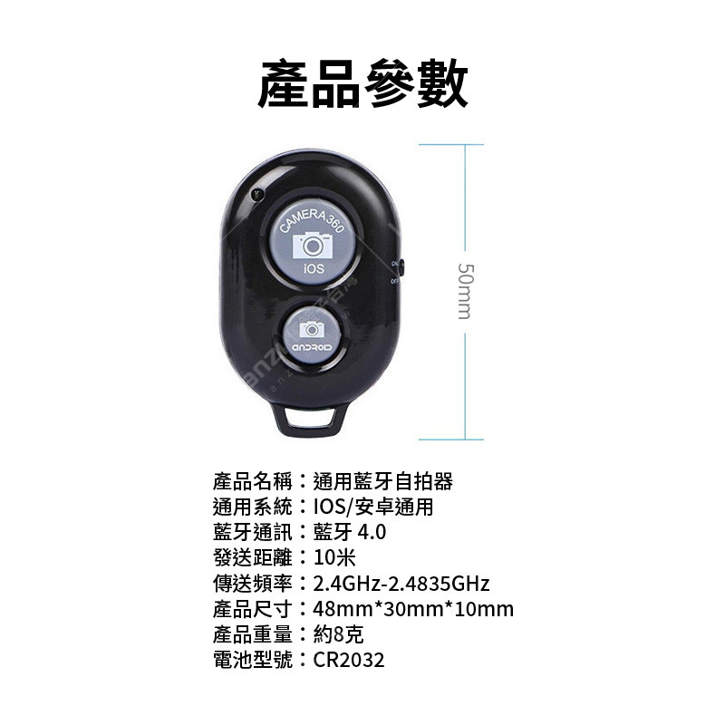 | 規格材質 | 產品名稱:通用藍牙自拍器 通用系統:IOS/安卓通用 藍牙通訊:藍牙 4.0 傳送距離:10米 電池壽命:12個月 傳送頻率:2.4GHz-2.4835GHz 電池型號:CR2032 產品尺寸:48mm*30mm*10mm 產品重量:約8克 |