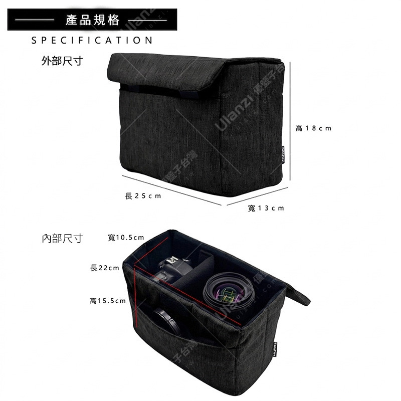 | 規格材質 | 防潑水PVC布料、抗撞棉、魔鬼氈 外部尺寸:25x13x18(cm) 內部尺寸:22×10.5×15.5(cm) 隔板尺寸:15×10.5(cm) |