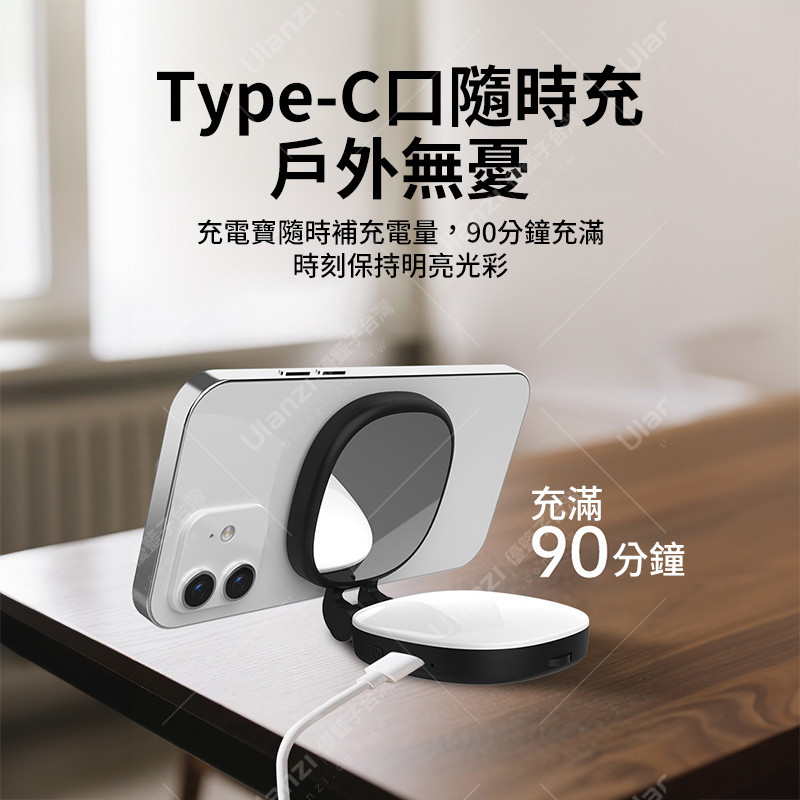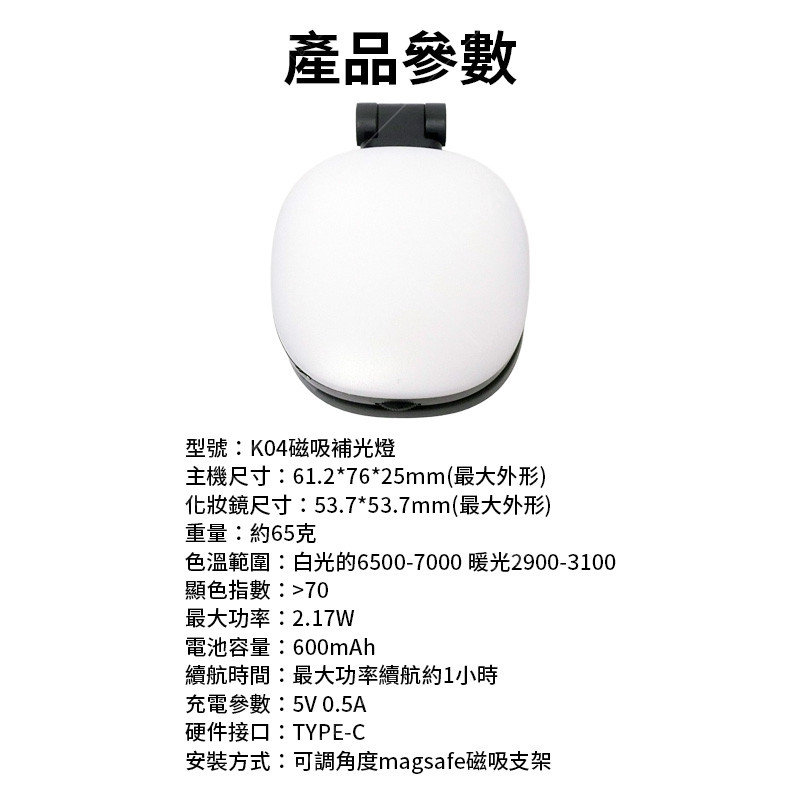 | 規格材質 | 型號:K04 主機尺寸:61.2*76*25mm(最大外形) 化妝鏡尺寸:53.7*53.7mm(最大外形) 重量:約65克 色溫範圍:白光的6500-7000 暖光2900-3100 顯色指數:>70 最大功率:2.17W 電池容量:600mAh 續航時間:最大功率續航約1小時 充電參數:5V 0.5A 硬件接口:TYPE-C 安裝方式:可調角度magsafe磁吸支架 |