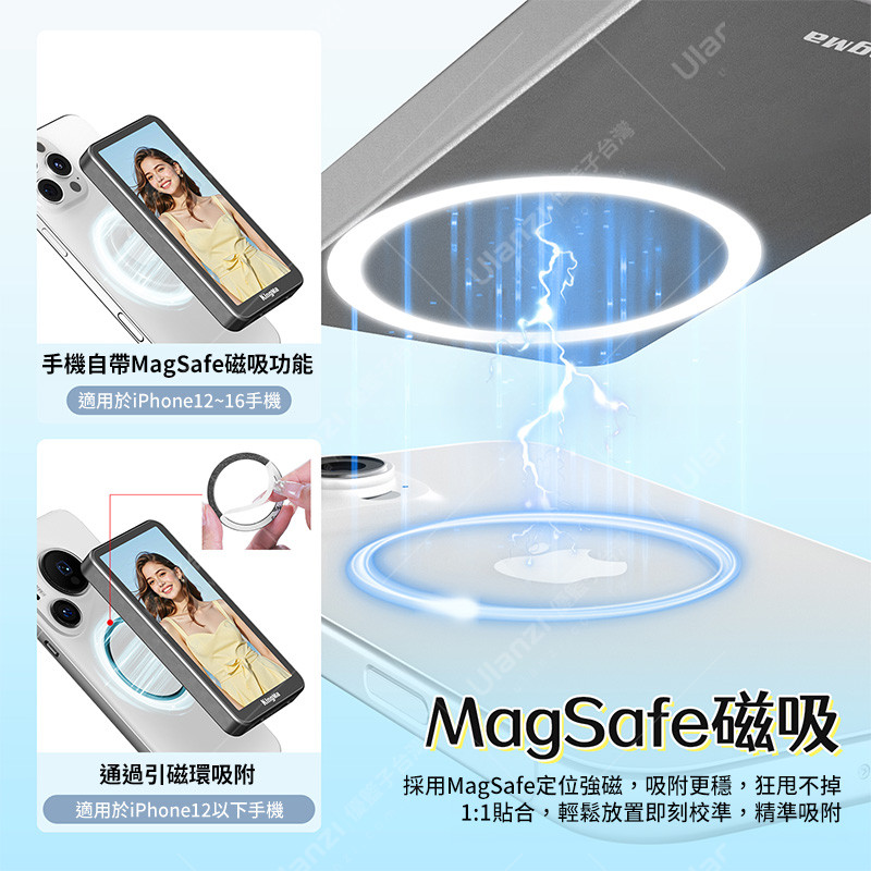 採用MagSafe定位強磁,吸附更穩,狂甩不掉,1:1貼合,輕鬆放置即刻校準,精準吸附,讓後置鏡頭自拍更方便