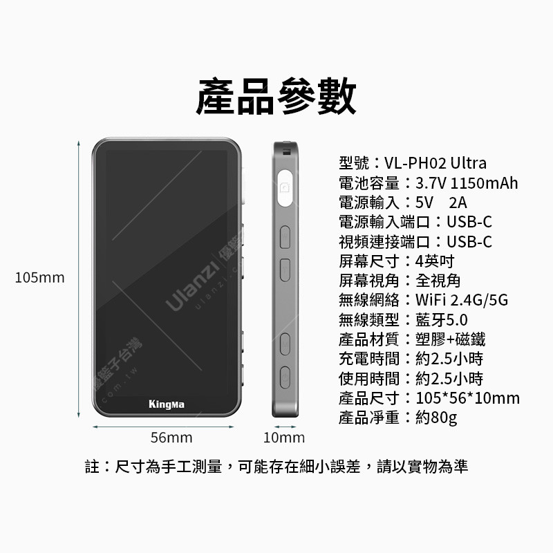 規格材質 | 型號:VL-PH02 Ultra 電池容量:3.7V 1150mAh 電源輸入:5V⎓2A 電源輸入端口:USB-C 視頻連接端口:USB-C 屏幕尺寸:4英吋 屏幕視角:全視角 無線網絡:WiFi 2.4G/5G 無線類型:藍牙5.0 產品材質:塑膠 磁鐵 充電時間:約2.5小時 使用時間:約2.5小時 產品尺寸:105*56*10mm 產品凈重:約80g 適用手機:iPhone蘋果系統11以上的機型 註:尺寸為手工測量,可能存在細小誤差,請以實物為準 |
