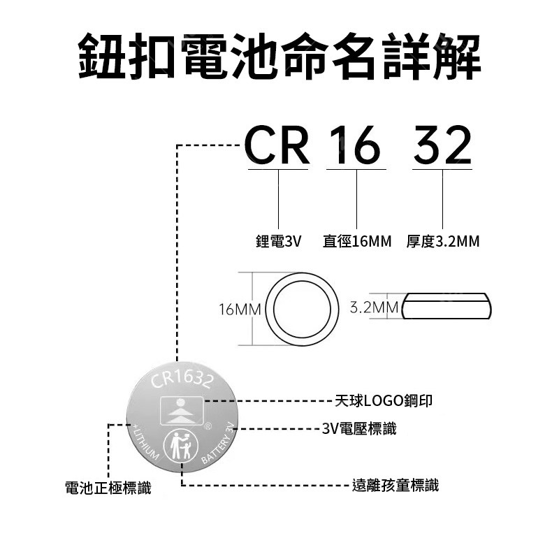| 商品標準配備包含 | 天球CR1632 3V 鈕扣電池 一顆入 |
