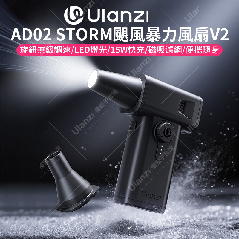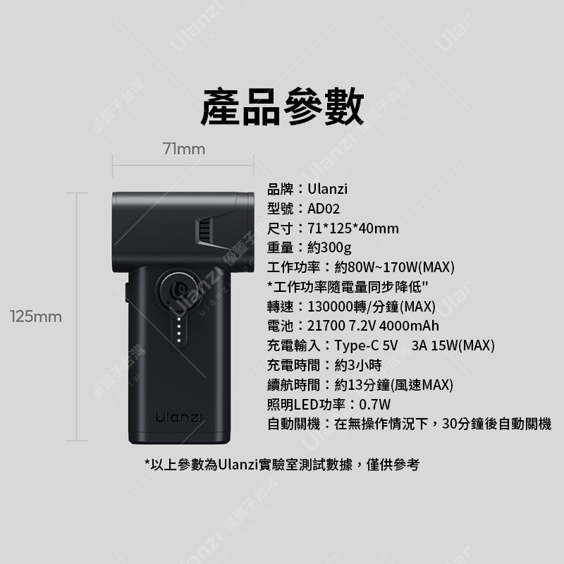 規格材質 | 品牌:Ulanzi 型號:AD02 尺寸:71*125*40mm 重量:約300g 工作功率:約80W~170W(MAX) *工作功率隨電量同步降低" 轉速:130000轉/分鐘(MAX) 電池:21700 7.2V 4000mAh 充電輸入:Type-C 5V⎓3A 15W(MAX) 充電時間:約3小時 續航時間:約13分鐘(風速MAX) 照明LED功率:0.7W 自動關機:在無操作情況下,30分鐘後自動關機 *以上參數為Ulanzi實驗室測試數據,僅供參考 |