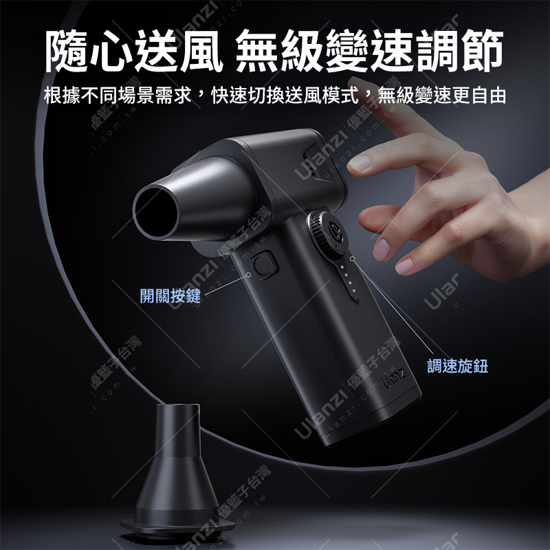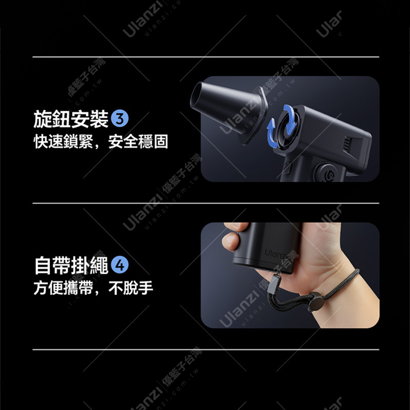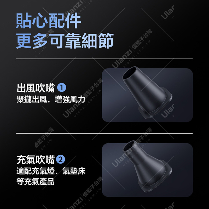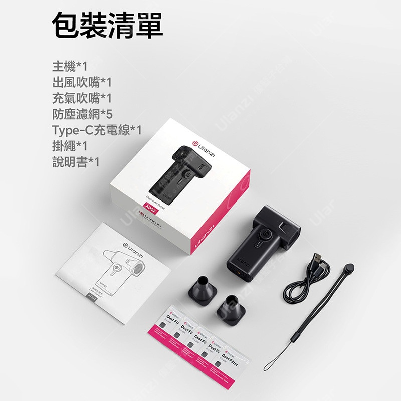 商品標準配備包含 | 主機*1 出風吹嘴*1 充氣吹嘴*1 防塵濾網*5 Type-C充電線*1 掛繩*1 說明書*1 |