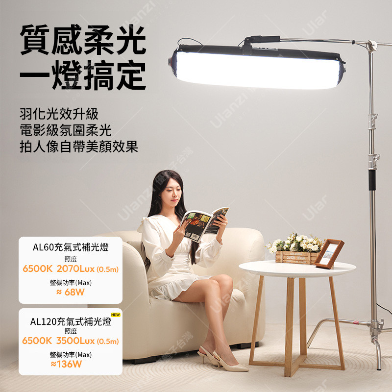 | 規格材質 | 品牌:Ulanzi 型號:AL120 燈體尺寸:1000*270*200mm 手柄尺寸:240*58*68.5mm 重量(裸機):約1100g 燈珠:雙色溫燈珠 色溫:2700K-6500K 顯色指數:≥96 光照度:6500K 3500Lux(0.5m) 整機功率(Max):≈136W 有效射程:3~6米 供電方式:Type-C口(支持PD3.1快充協議) *以上參數為Ulanzi實驗室測試,僅供參考,如有變更,恕不另行通知。 |