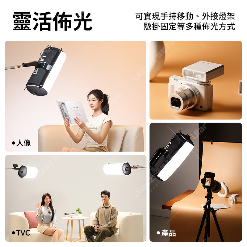 可實現手持移動、外接燈架、懸掛固定等多種佈光方式
