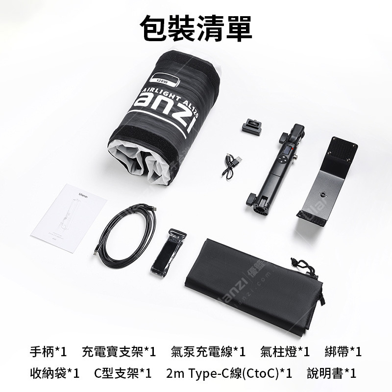 | 商品標準配備包含 | 手柄*1 充電寶支架*1 氣泵充電線*1 氣柱燈*1 綁帶*1 收納袋*1 C型支架*1 2m Type-C線(CtoC)*1 說明書*1 |