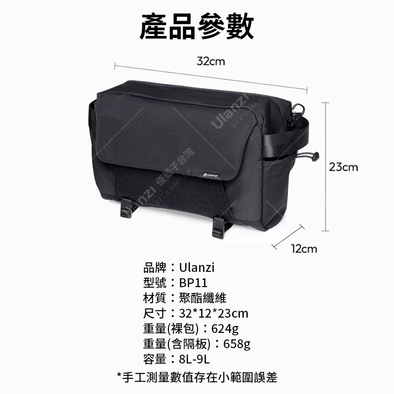 | 規格材質 | 品牌:Ulanzi 型號:BP11 材質:聚酯纖維 尺寸:32*12*23cm 重量(裸包):624g 重量(含隔板):658g 容量:8L-9L *手工測量數值存在小範圍誤差 |
