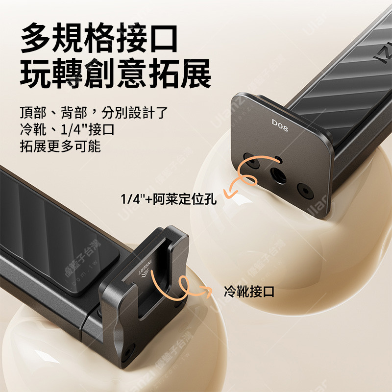 頂部、背部,分別設計了冷靴、1/4″接口,拓展更多可能
