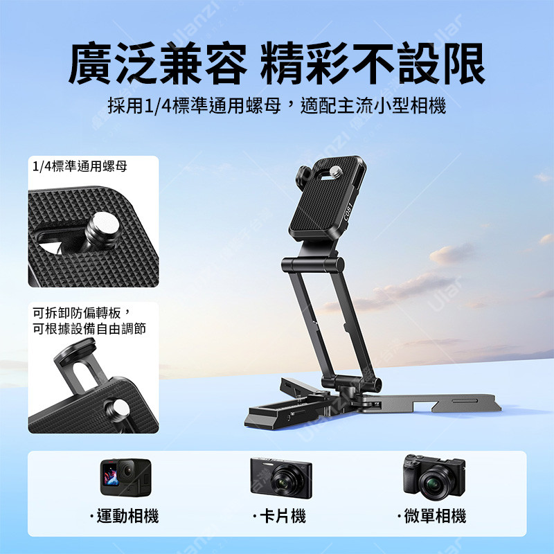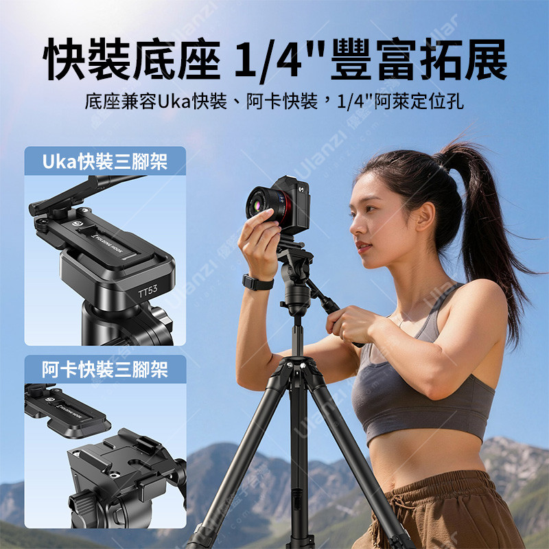 底座兼容Uka快裝、阿卡快裝,1/4″阿萊定位孔,腳架輕鬆拓展