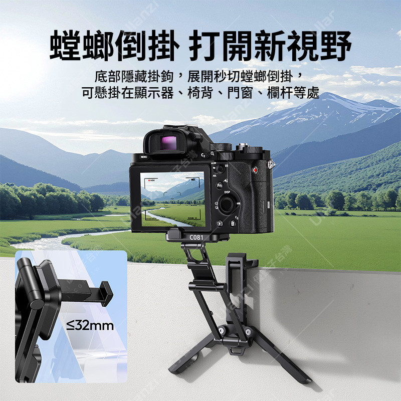 底部隱藏掛鉤,展開秒切螳螂倒掛,可懸掛在顯示器、椅背、門窗、欄杆等處
