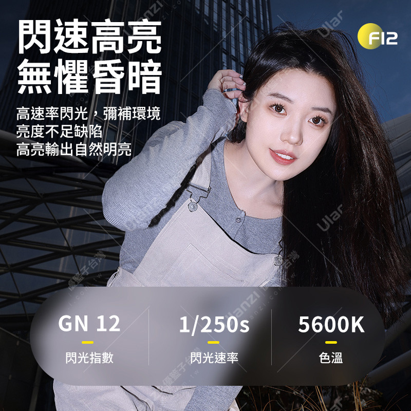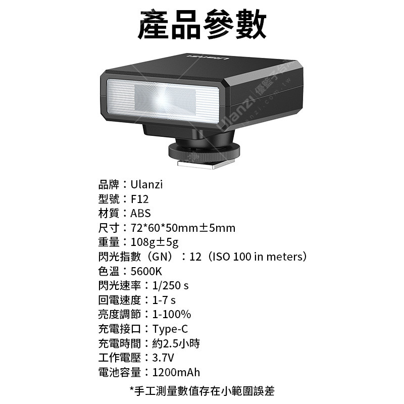 | 規格材質 | 品牌:Ulanzi 型號:F12 材質:ABS 尺寸:72*60*50mm±5mm 重量:108g±5g 閃光指數(GN):12(ISO 100 in meters) 色溫:5600K 閃光速率:1/250 s 回電速度:1-7 s 亮度調節:1-100% 充電接口:Type-C 充電時間:約2.5小時 工作電壓:3.7V 電池容量:1200mAh