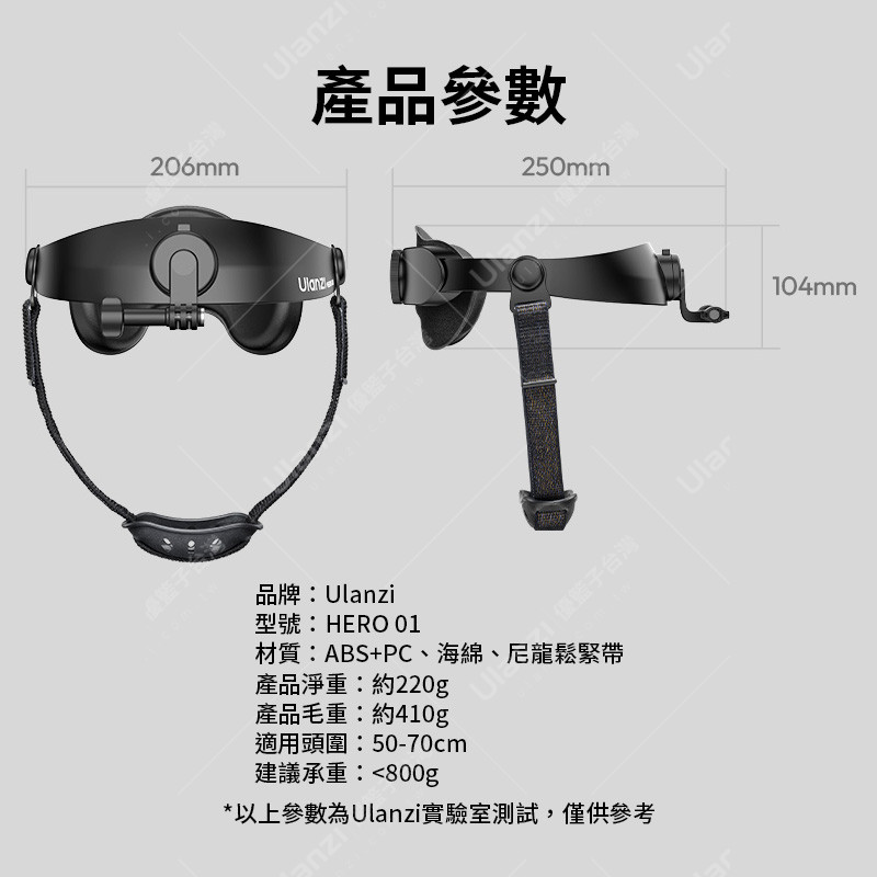 | 規格材質 | 品牌:Ulanzi 型號:HERO 01 材質:ABS PC、海綿、尼龍鬆緊帶 產品淨重:約220g 產品毛重:約410g 適用頭圍:50-70cm 建議承重: |