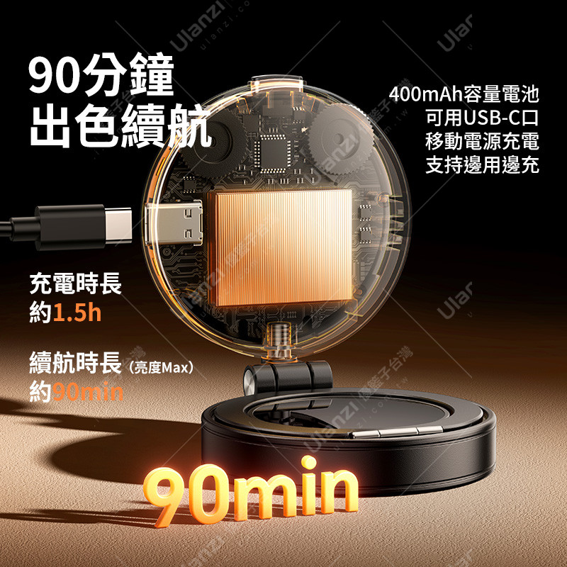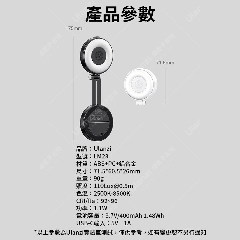 規格材質 | 品牌:Ulanzi 型號:LM23 材質:ABS PC 鋁合金 尺寸:71.5*60.5*26mm 重量:90g 照度:110Lux@0.5m 色溫:2500K-8500K CRI/Ra:92~96 功率:1.1W 電池容量:3.7V/400mAh 1.48Wh USB-C輸入:5V⎓1A |