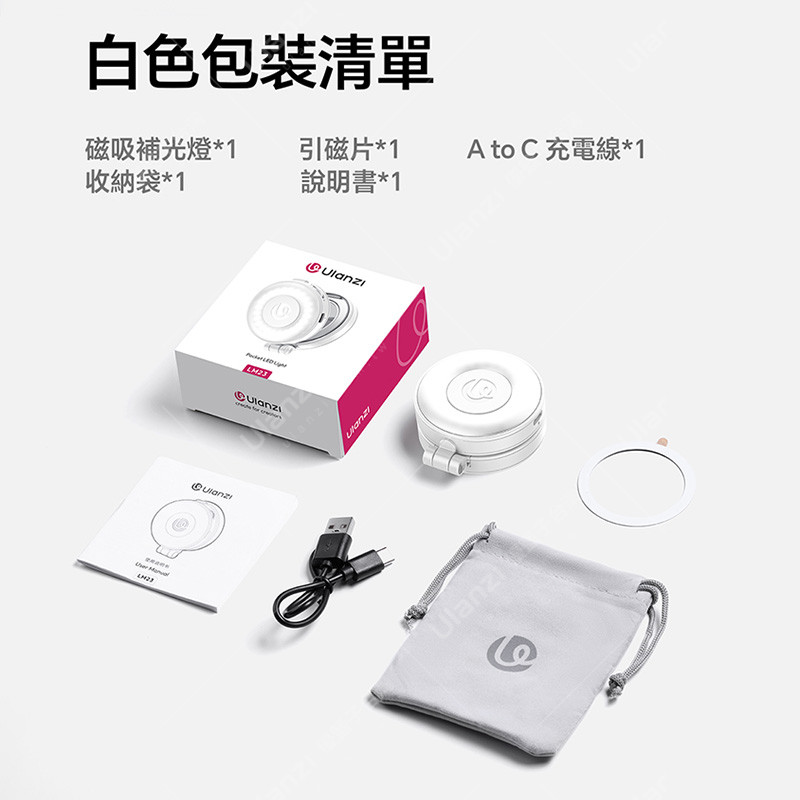 商品標準配備包含 | 磁吸補光燈*1 引磁片*1 A to C 充電線*1 收納袋*1 說明書*1 |