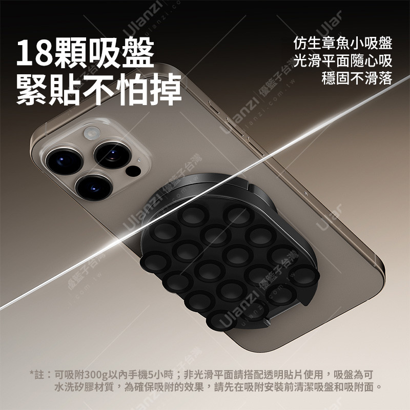 *註:可吸附300g以內手機5小時;非光滑平面請搭配透明貼片使用,吸盤為可水洗矽膠材質,為確保吸附的效果,請先在吸附安裝前清潔吸盤和吸附面。
