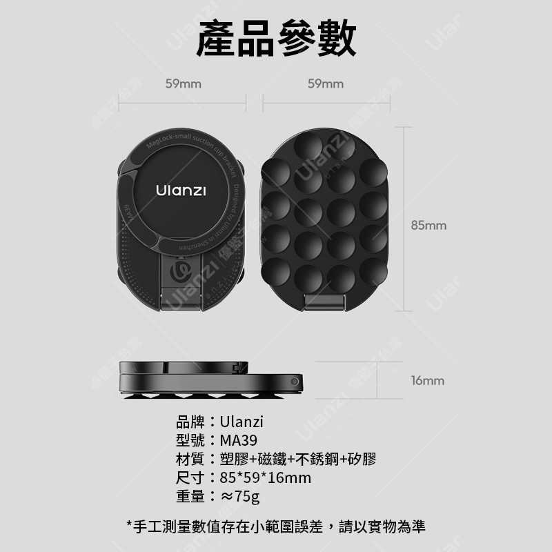 規格材質 | 品牌:Ulanzi 型號:MA39 材質:塑膠、磁鐵、不銹鋼、矽膠 尺寸:85*59*16mm 重量:≈75g *手工測量數值存在小範圍誤差,請以實物為準 |
