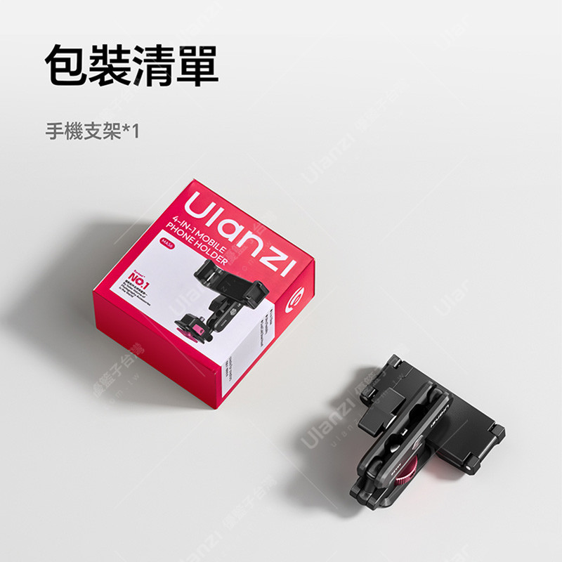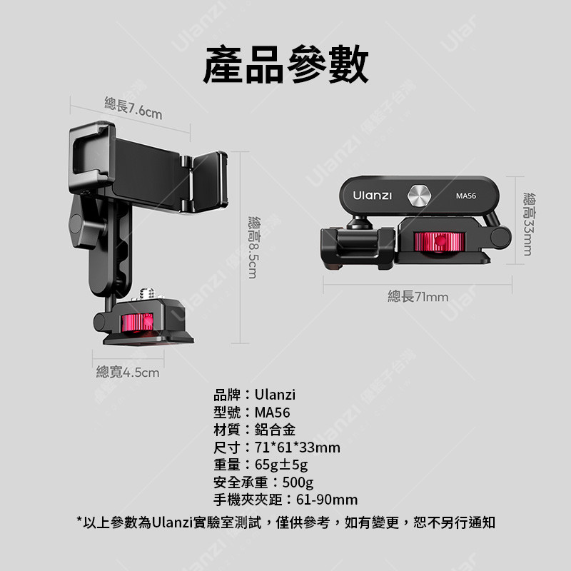 | 規格材質 | 品牌:Ulanzi 型號:MA56 材質:鋁合金 尺寸:71*61*33mm 重量:65g±5g 安全承重:500g 手機夾夾距:61-90mm *以上引數為Ulanzi實驗室測試,僅供參考,如有變更,恕不另行通知 |