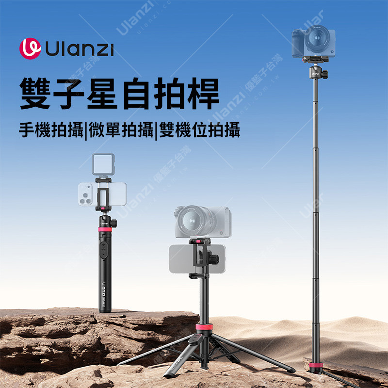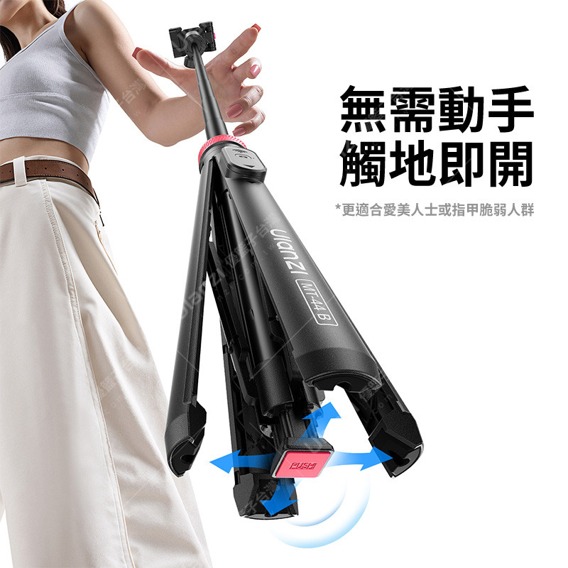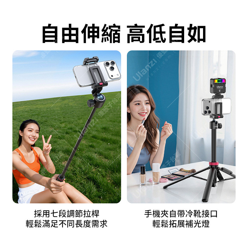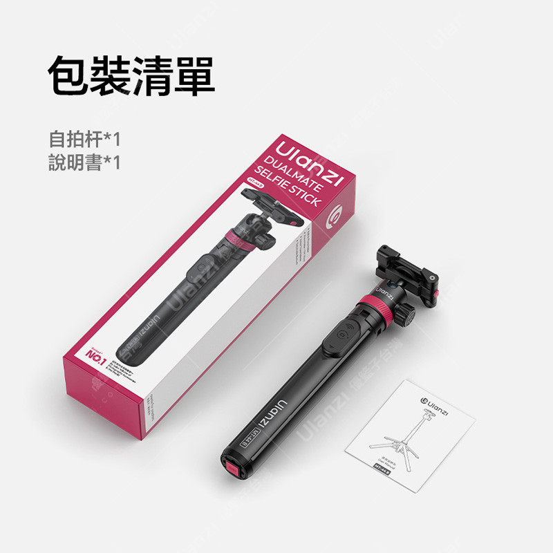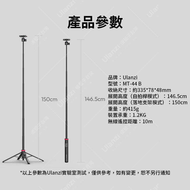 | 規格材質 | 品牌:Ulanzi 型號:MT-44 B 收納尺寸:約335*78*48mm 展開高度(自拍桿模式):146.5cm 展開高度(落地支架模式):150cm 重量:約415g 裝置承重:1.2KG 無線遙控距離:10m *以上參數為Ulanzi實驗室測試,僅供參考,如有變更,恕不另行通知 |