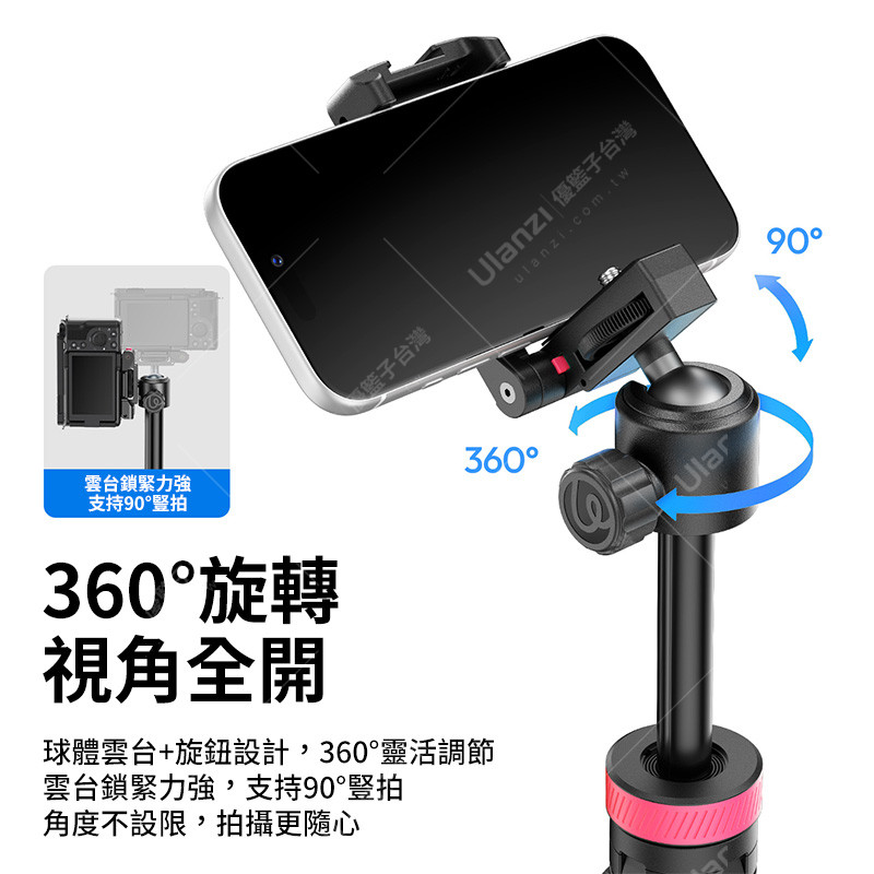 球體雲台 旋鈕設計,360°靈活調節,雲台鎖緊力強,支持90°豎拍,角度不設限,拍攝更隨心