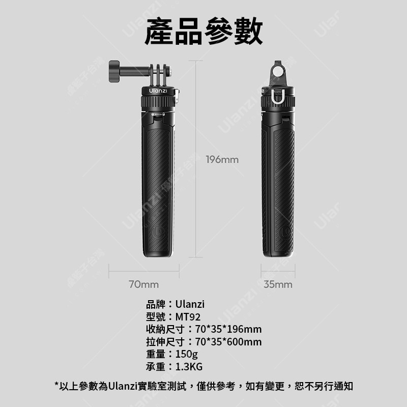 | 規格材質 | 品牌:Ulanzi 型號:MT92 收納尺寸:70*35*196mm 拉伸尺寸:70*35*600mm 重量:150g 承重:1.3KG *以上參數為Ulanzi實驗室測試,僅供參考,如有變更,恕不另行通知 |