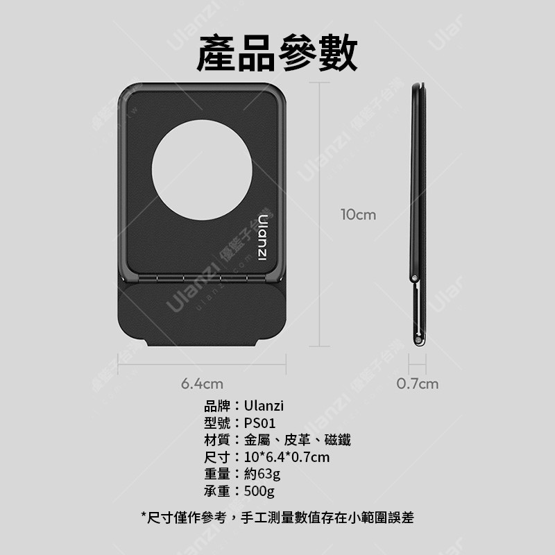 | 規格材質 | 品牌:Ulanzi 型號:PS01 材質:金屬、皮革、磁鐵 尺寸:10*6.4*0.7cm 重量:約63g 承重:500g *尺寸僅作參考,手工測量數值存在小範圍誤差 |