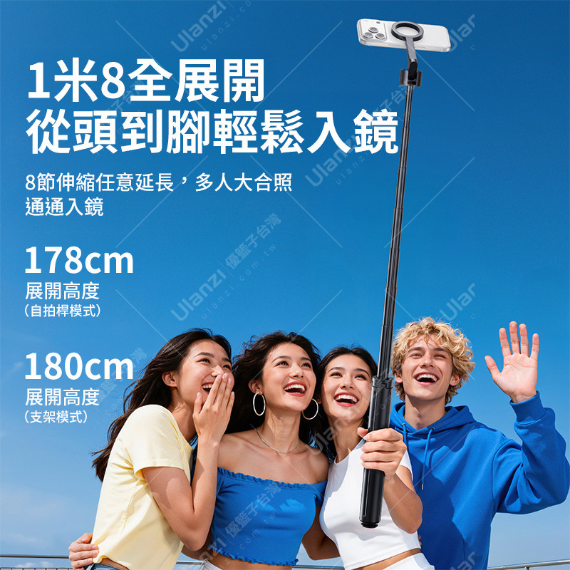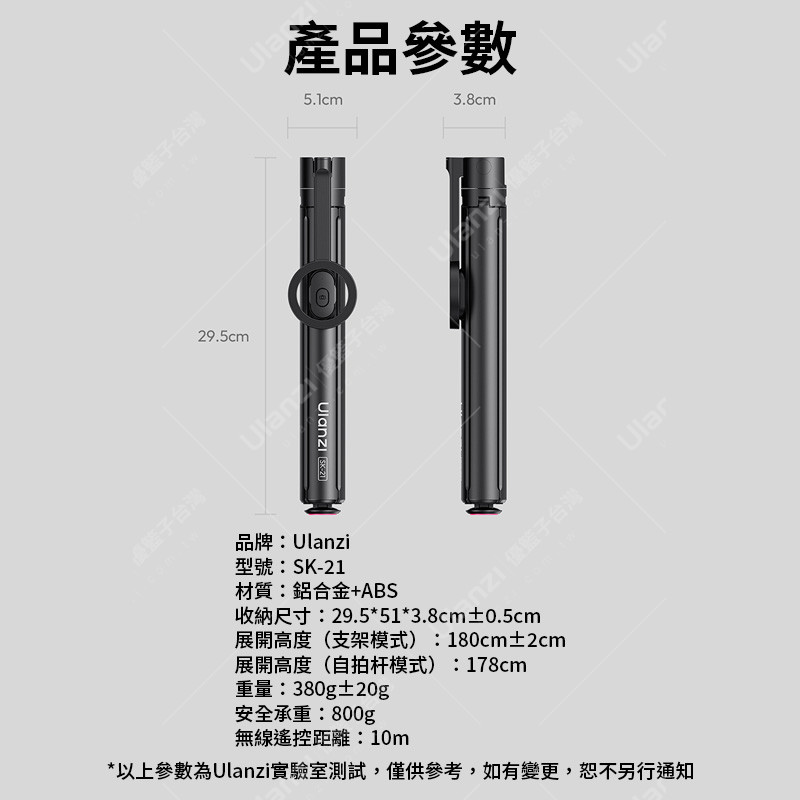 | 規格材質 | 品牌:Ulanzi 型號:SK-21 材質:鋁合金 ABS 收納尺寸:29.5*51*3.8cm±0.5cm 展開高度(支架模式):180cm±2cm 展開高度(自拍杆模式):178cm 重量:380g±20g 安全承重:800g 無線遙控距離:10m *以上引數為Ulanzi實驗室測試,僅供參考,如有變更,恕不另行通知 |