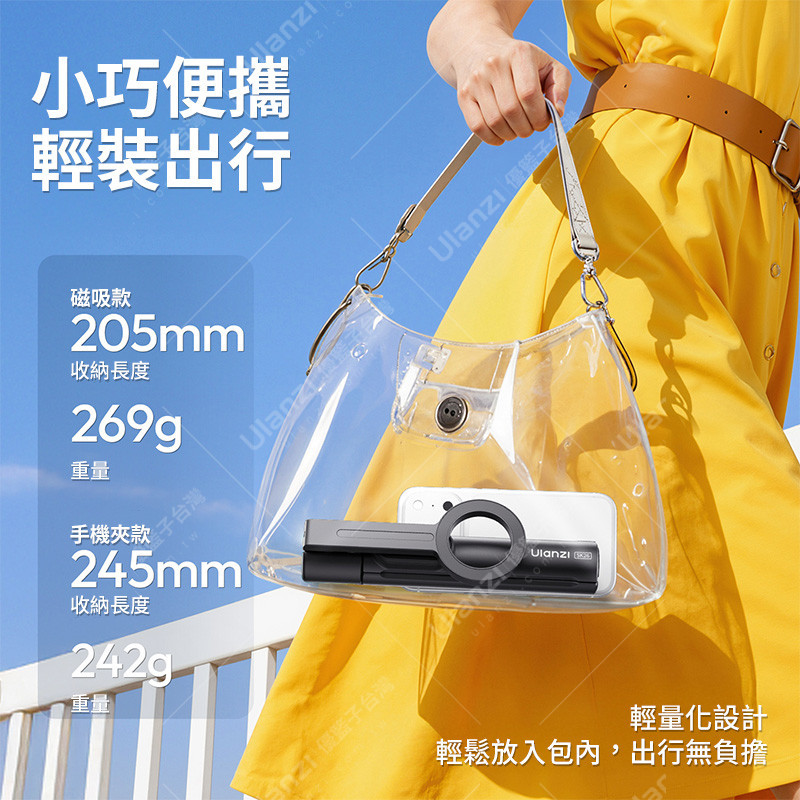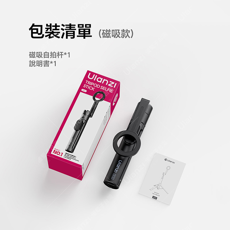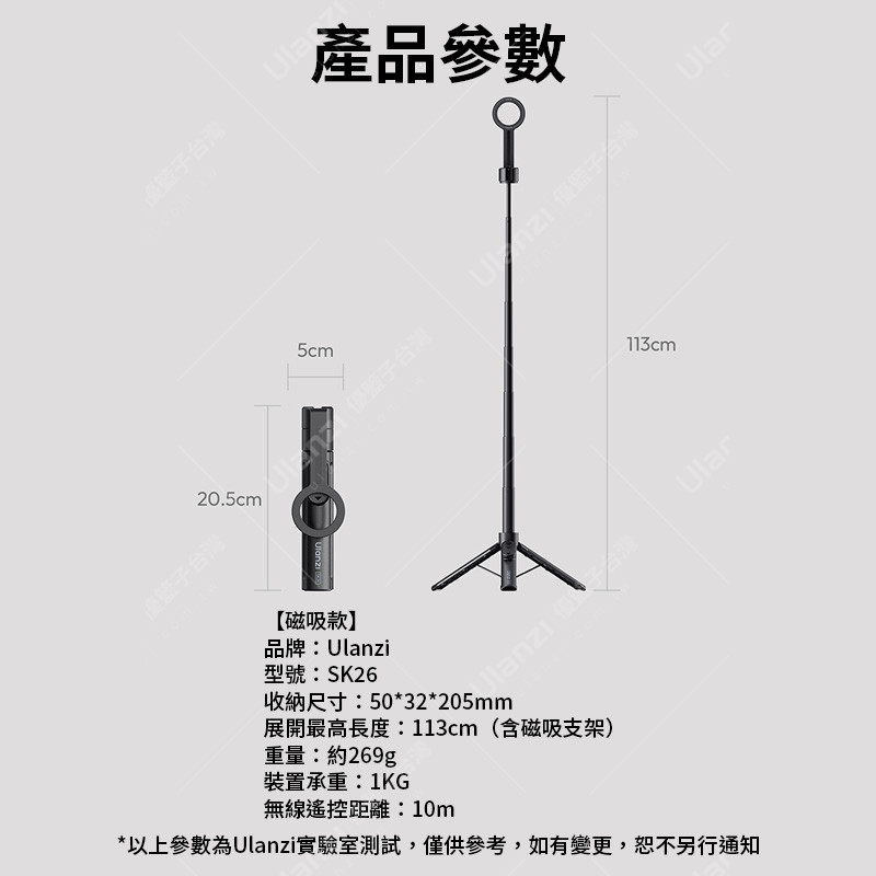 | 規格材質 | 品牌:Ulanzi 型號:SK26 磁吸款 收納尺寸:50*32*205mm 展開最高長度:113cm(含磁吸支架) 重量:約269g 裝置承重:1KG 無線遙控距離:10m *以上參數為Ulanzi實驗室測試,僅供參考,如有變更,恕不另行通知 |