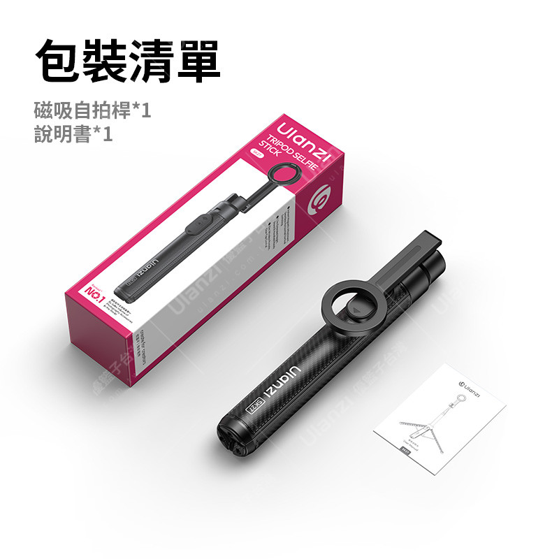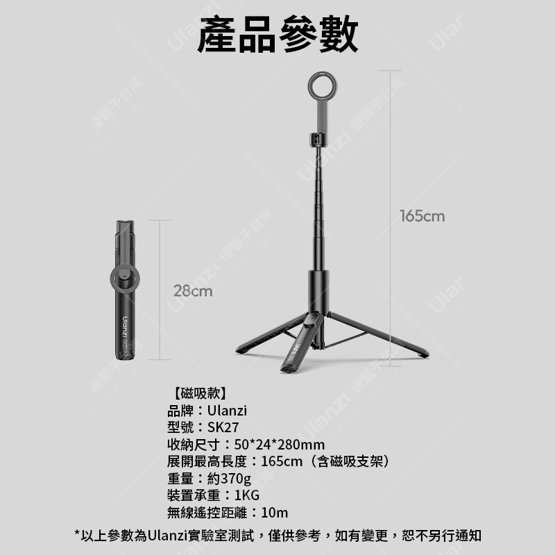 | 規格材質 | 品牌:Ulanzi 型號:SK27 磁吸款 收納尺寸:50*24*280mm 展開最高長度:165cm(含磁吸支架) 重量:約370g 裝置承重:1KG 無線遙控距離:10m *以上參數為Ulanzi實驗室測試,僅供參考,如有變更,恕不另行通知 |
