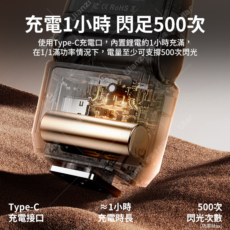 使用Type-C充電口,內置鋰電約1小時充滿,在1/1滿功率情況下,電量至少可支撐500次閃光