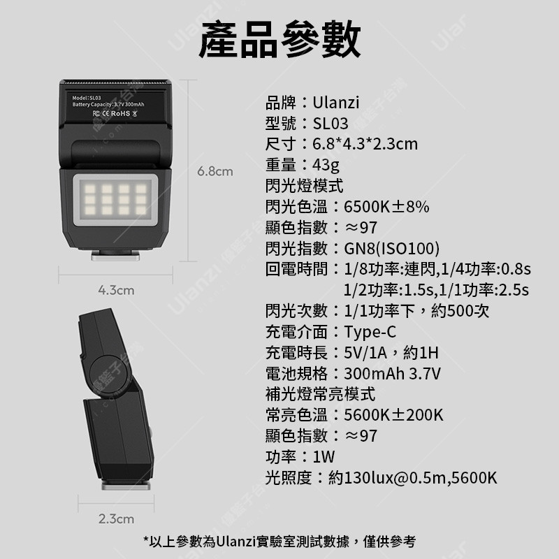 | 規格材質 | 品牌:Ulanzi 型號:SL03 尺寸:6.8*4.3*2.3cm 重量:43g 閃光燈模式 閃光色溫:6500K±8% 顯色指數:≈97 閃光指數:GN8(ISO100) 回電時間:1/8功率:連閃,1/4功率:0.8s 1/2功率:1.5s,1/1功率:2.5s 閃光次數:1/1功率下,約500次 充電介面:Type-C 充電時長:5V/1A,約1H 電池規格:300mAh 3.7V 補光燈常亮模式 常亮色溫:5600K±200K 顯色指數:≈97 功率:1W 光照度:約130lux@0.5m,5600K *以上參數為Ulanzi實驗室測試數據,僅供參考 |