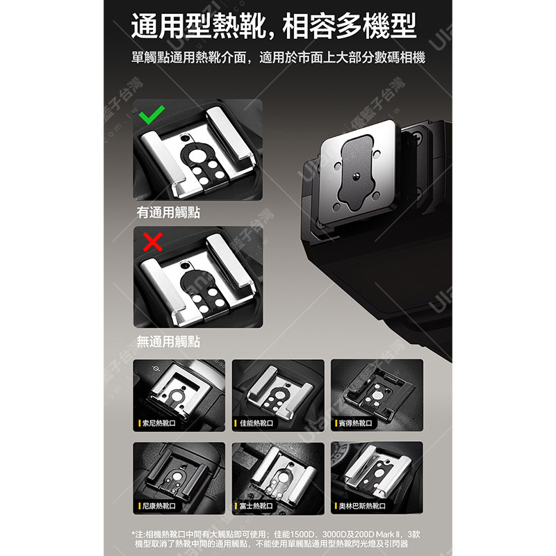 單觸點通用熱靴接口,適用於市面上大部分數碼相機